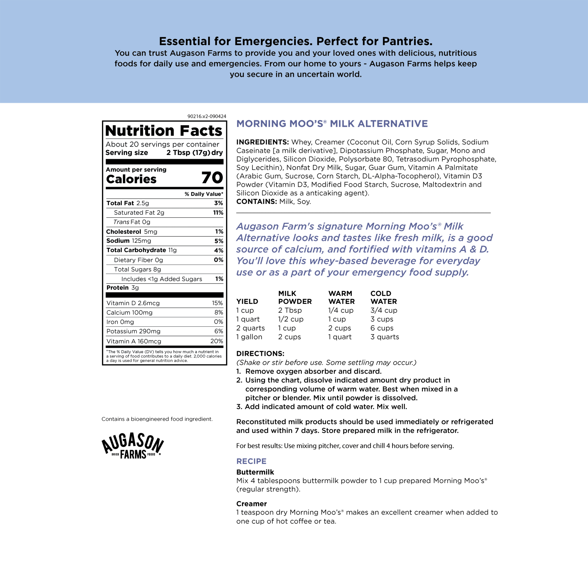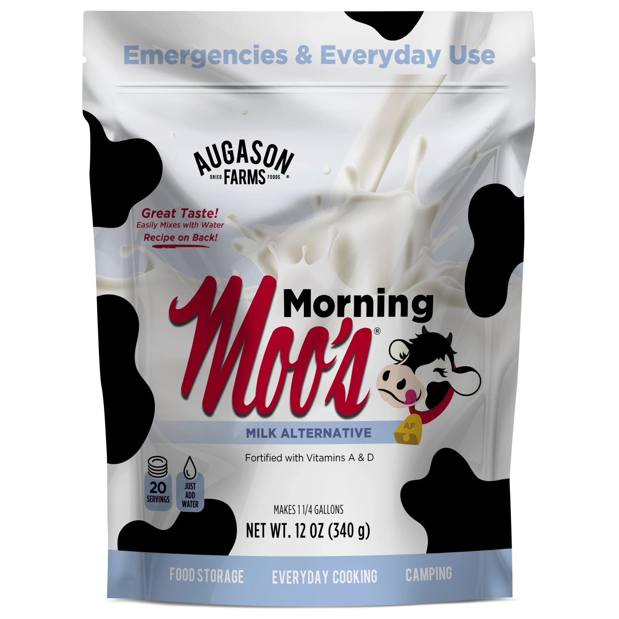 The Augason Farms Morning Moo Milk is a smooth, creamy powdered drink mix designed for everyday use or long-term storage. Just add water for a reliable milk substitute that’s perfect for drinking, cereal, coffee, or cooking—no refrigeration needed.