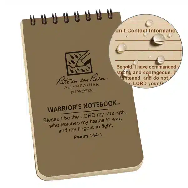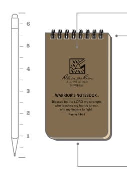 The Rite in the Rain® 3×5 Warrior’s Notebook features 114 pages (57 sheets) of All-Weather Paper that sheds water, allowing you to write anywhere, in any weather including 13 pages of select Biblical verses that have been a source of comfort, encouragement, and strength to Warriors for thousands of years.