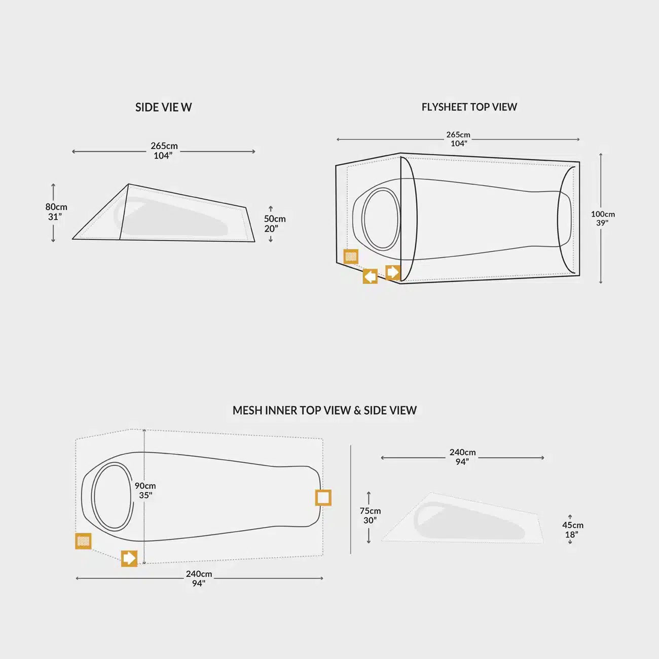 The Ionosphere IX will shelter you from all but the worst inclement weather, with a 5000mm hydrostatic head (HH) polyurethane (PU) coated fly sheet, with taped seams. The Ionosphere IX has an impressive floor space, measuring 240cm/94″ long and 90cm/35″ wide, creating ample room for a single person with some equipment. In an emergency, the Ionosphere IX can accommodate two people. (The WGTE series is Weather Gear Tested Edition, products designed for, and tested in a wide range of weather conditions.)