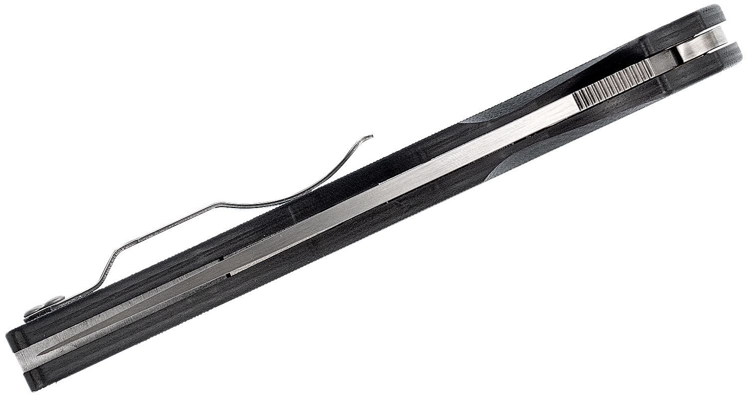 The blade is supported by a liner-less handle that includes textured G-10 scales, a stainless steel backspacer, and an ultra-refined, precision-machined back lock mechanism. Four sets of threaded inserts in the scales allow its polished hourglass pocket clip to be configured for tip-up or tip-down carry on either side of the body, and a generously sized lanyard hole easily accommodates fobs and lanyards.