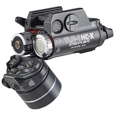The Streamlight TLR-1 HL-X is a dual-fuel high intensity pistol light delivering a 1,500-lumen beam and supports rapid battery changes via its front-loading compartment, eliminating the need to remove the light from the firearm.