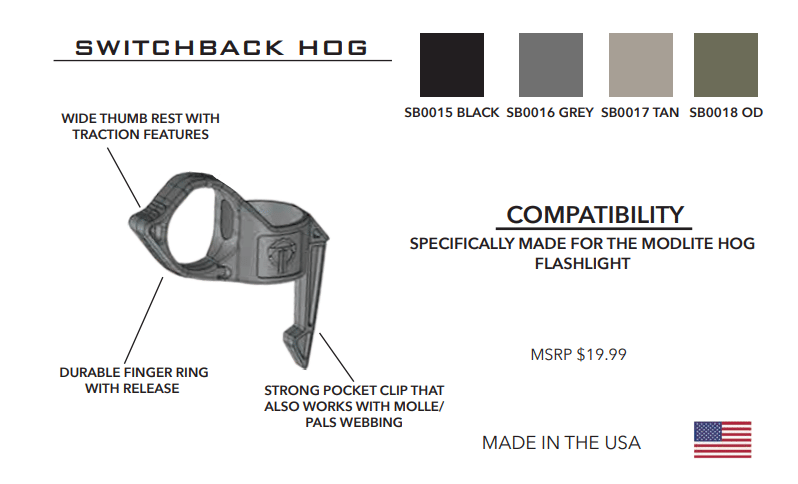 The THYRM SwitchBack HOG for the Modlite HOG series of handheld lights is a must have accessory. The SwitchBack HOG allows reliable deployment with or without gloves and provides a two-handed firing grip while deploying the light. Standard low-light techniques can also be employed.